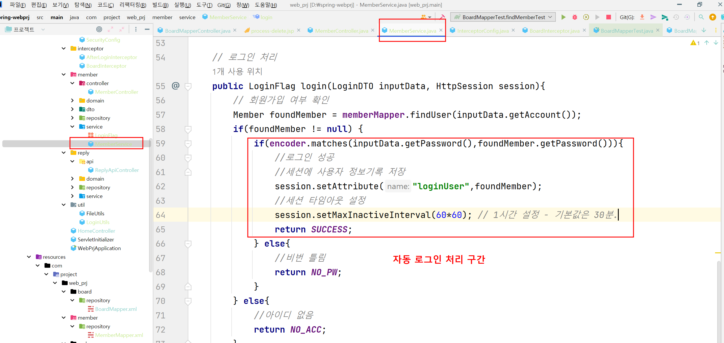 자동 로그인은 쿠키를 활용. 세션은 브라우저창을 닫으면 세션이 다 지워지기 때문이다. - 클라이언트가 자동로그인체크하여 로그인 시도 - 로그인 시점에 세션아이디를 쿠키에 저장 - 쿠키 수명을 자동로그인 해주고 싶은 기간을 설정(이번 실습에는 90일로 한다.) ex) 세션 ID : abcdef123 -> 쿠키에 abcdef123 을 저장 함과 동시에 DB에도 로그인한 사람의 정보에 세션아이디 저장 - 다음날 클라이언트가 접속할때 쿠키의 abcdef123과 DB의 abcdef123은 같다.! - 서버에서 쿠키의 세션 아이디를 확인 하고, 이를 기반으로 DB의 회원정보를 조회 일치하면 바로 자동로그인을 시킨다. ex) - a = abc // b = def // c = ghi (아이디 = 세션아이디) 모두 자동..