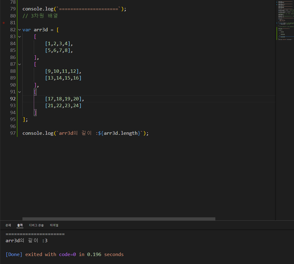 다차원 사용 예시 -> // 1차원 : 1명 학생의 4과목 시험점수를 저장한다. // 2차원 : 1학급의 5명의 4과목 시험정수를 저장한다. // 3차원 : 1학년의 3학급의 6명의 7과목을 저장한다. var arr3d = [ [ [1,2,3,4], [5,6,7,8], ], [ [9,10,11,12], [13,14,15,16] ], [ [17,18,19,20], [21,22,23,24] ] ]; console.log(`arr3d의 길이 :${arr3d.length}`); console.log(arr3d[0]); console.log(arr3d[1][1]); console.log(arr3d[0][1][2]);