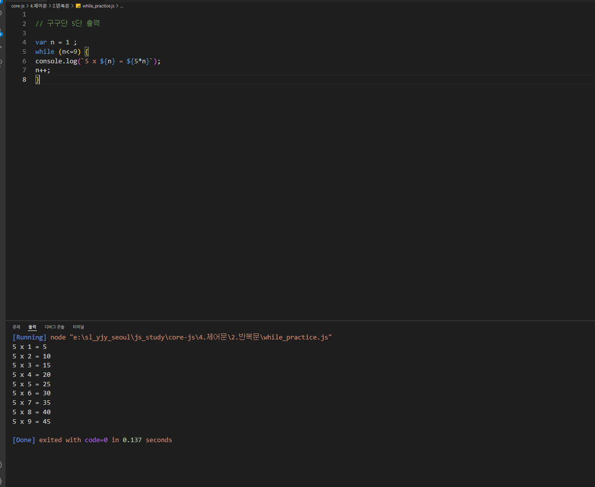 // 안녕을 5번 출력 for(var i = 0; i < 5; i++) { console.log('안녕'); } /* var i = 0; while ( i < 5) { console.log('안녕'); i++ } */ for문과 while문을 실행하면 동일한 결과가 나온다. while은 코드가 많아지면 반복 횟수를 파악하기 힘들지만 for는 한줄에 반복 조건들이 있어 파악하기가 쉽다. *횟수가 지정된 반복문은 for를 쓰는게 유리하다.------------------------------------------------------- --------------------------------------------------------------------- ↓ while문 while문을 for문으로 바꾸기..